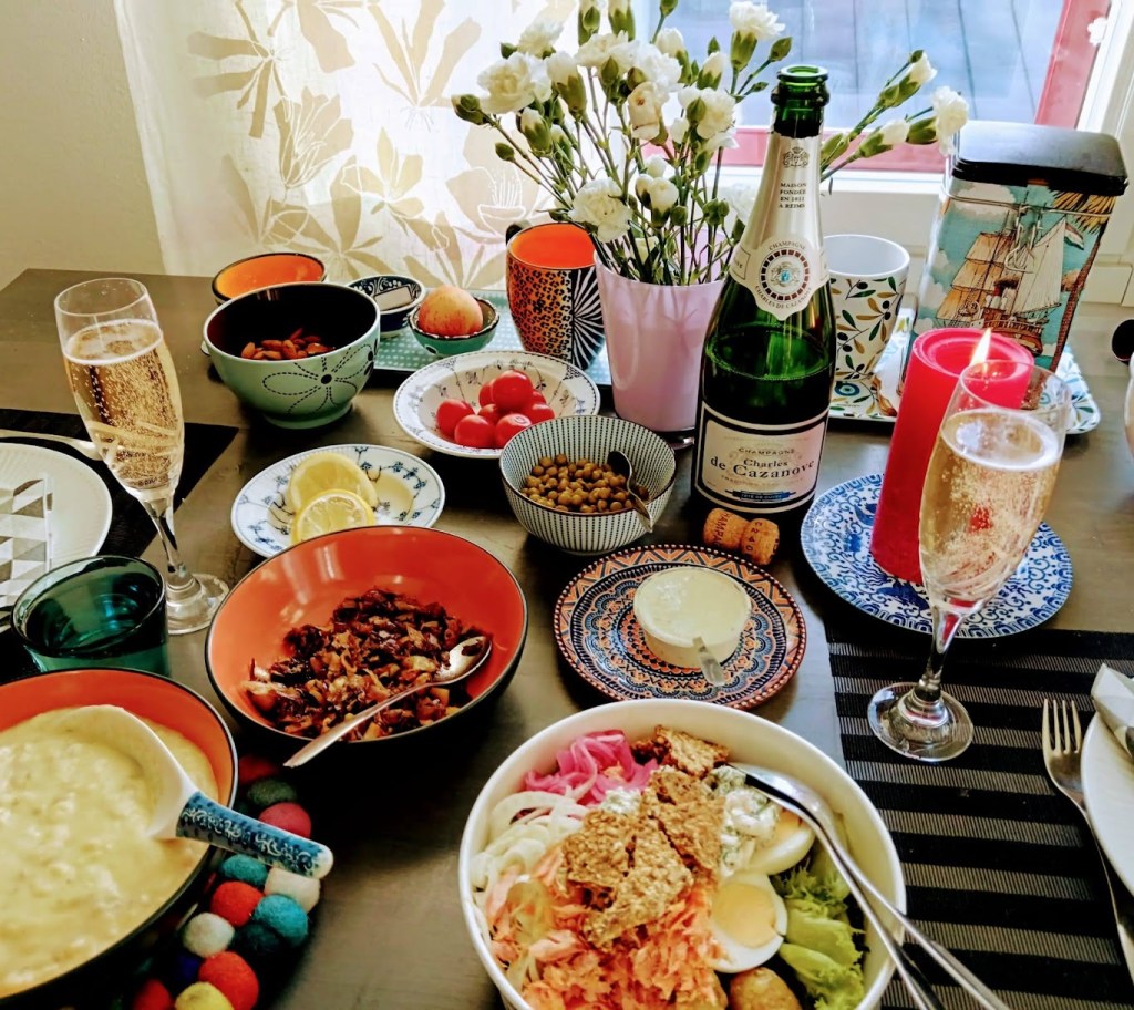 Minä ja sisko saimme eilen kutsun naapurini Leenan luo kalasopalle. Hän tarjosi ruokajuomana kuohuviiniä. Keitto ja kuplajuoma maistuivat.