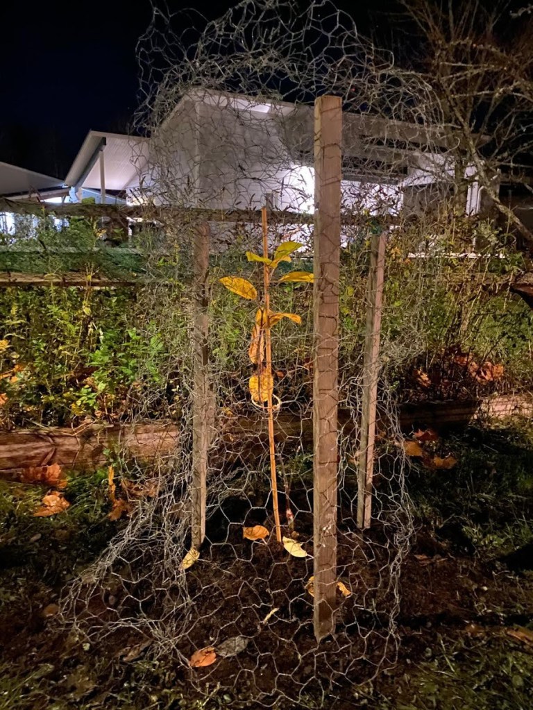 Miika lähetti illalla viestin. Istutin tänään kaksi omenapuun tainta. Löysin iskän tekemät tukikepit ja verkkoa. Muisto elää ja puuhat jatkuvat.