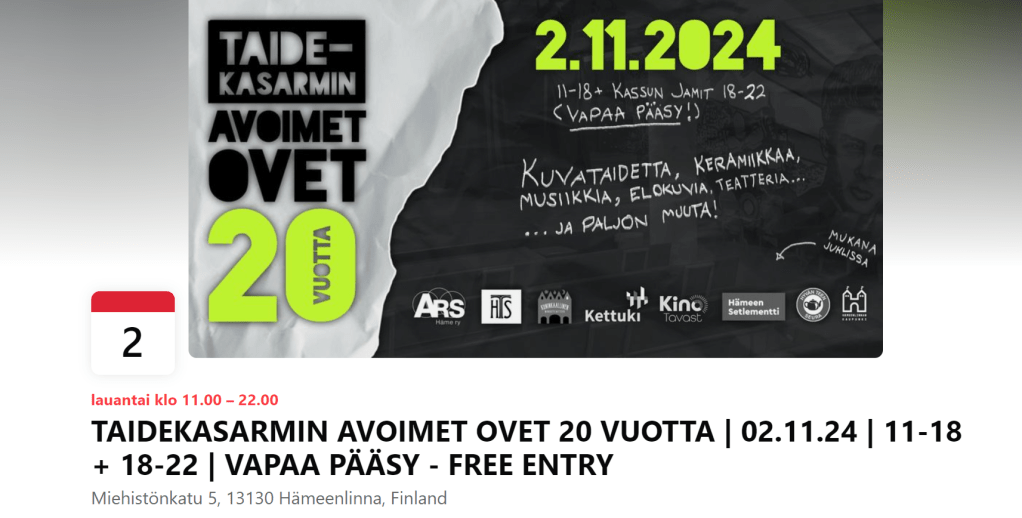 Lauantaina Hämeenlinnan taidekasarmillakin on avoimet ovet. Suunnittelemme kävelyretkeä Jaanan, Fidelin ja naapuri Leenan kanssa, jos sää on kelvollinen. Luvassa on viilenevää, mutta sehän on vain pukeutumiskysymys. Perinteinen kynttilöiden vienti haudoille pyhäinpäivänä jää tänä vuonna väliin, sillä meillä ei ole autoa käytössä.