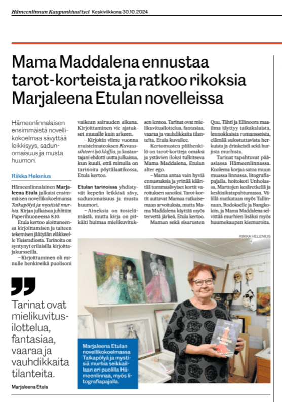 Tähtihetket jatkuvat, sillä tämän päivän paikallislehti Kaupunkiuutiset julkaisi jutun tuoreesta kirjastani. Mainesanat leikkisyys, sadunomaisuus ja musta huumori säväyttivät. Kirjoittaminen on tuottanut iloa ja rytmittänyt päivät.