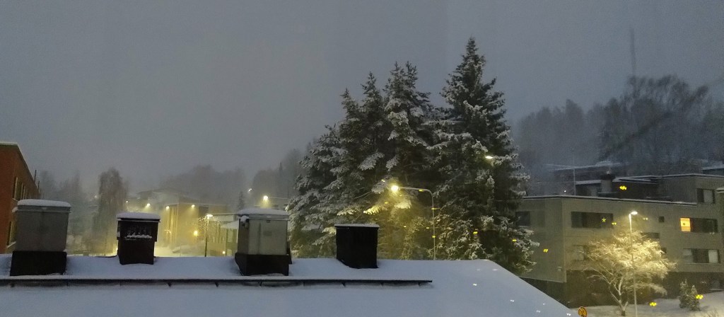 Pyry alkoi iltapäivällä. Katselin turvallisesti ikkunan takaa lumisadetta katulamppujen valokeiloissa.