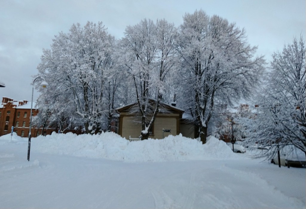 Puut ovat upean näköisiä lumipeitteen alla. Pakkasta on kahdeksan astetta. Meillä on siis näillä näkymillä kunnon talvi ja valkea joulu.