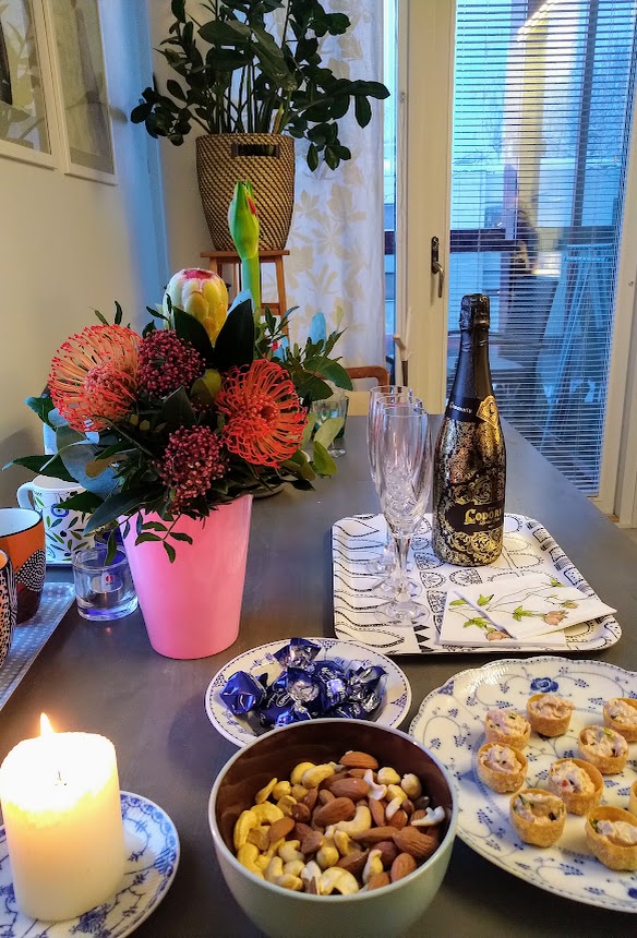 Vietimme iltapäivällä pienimuotoista pikkujoulua naapuri Leenan, Jaanan ja Fidelin kanssa. Sain siskolta upean proteakimpun, joka toivottavasti kestää maljakossa uuteen vuoteen asti.