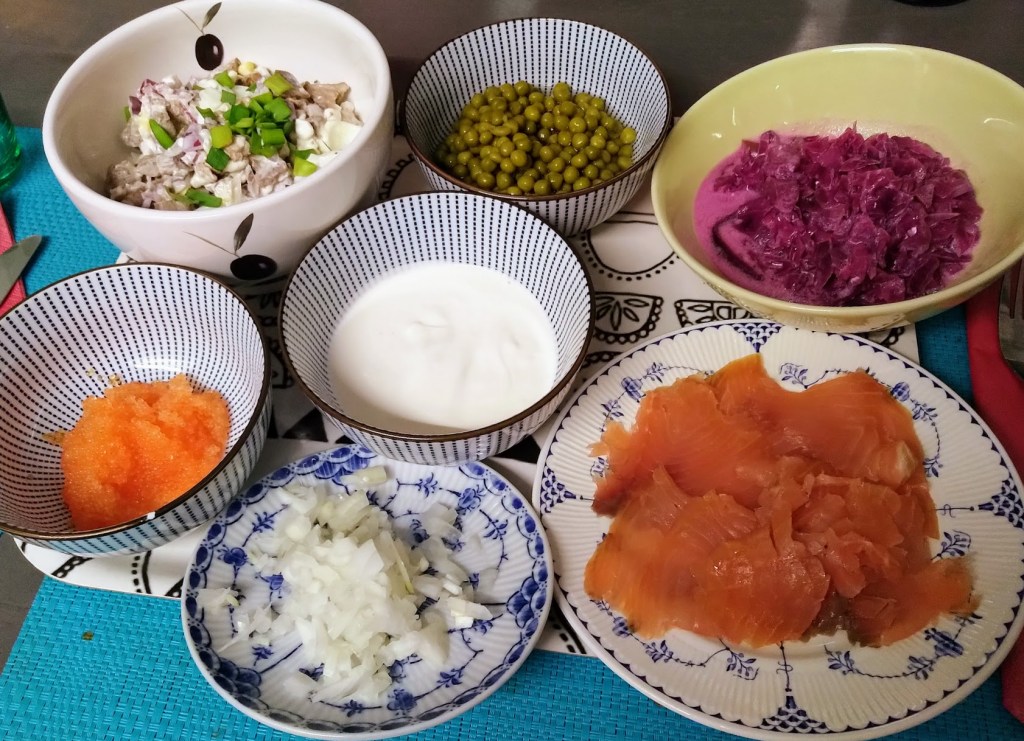 Punakaali onnistui ja maku oli sopivan pehmeä. Se sai seurakseen purkkiherneitä, omatekoista metsäsienisalaattia, siianmätiä, smetanaa, sipulisilppua sekä kylmäsavulohta.