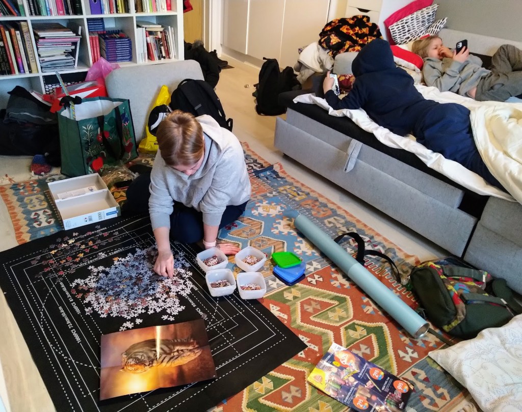 Nuoriso lähti iltapäivällä kaupungille. Minä jäin kotiin kissavahdiksi. Hämmästelin, kun he viihtyivät tuntikausia omissa riennoissa. Yhteiselomme jatkuu vielä huomiseen.