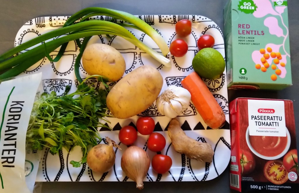 Joulun ja uuden vuoden herkkujen jälkeen on hyvä kokata vähän kevyemmin. Kuuma keitto on kelpo vaihtoehto. Tutkin jääkaappia ja hyödynsin sieltä löytyvät juurekset. Paloittelin perunat, porkkanat, punasipulin ja palsternakan kuutioiksi ja kiehautin kasvisliemessä. Lohkoin mukaan myös kypsän tomaatin.