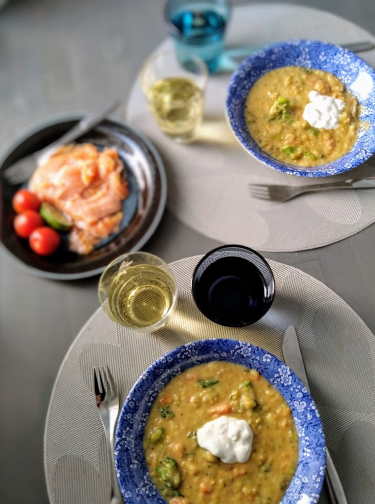 Hauduttelin ainekset kypsiksi kasvisliemessä ja soseutin kevyesti. Lisäsin viherainekset vasta viime minuuteilla, sillä halusin niiden jäävän rapsakoiksi.