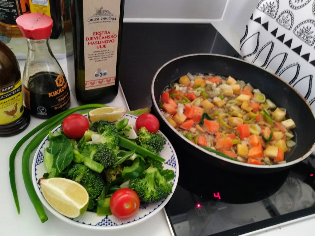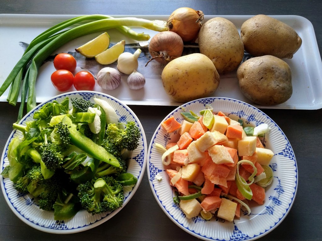 Olen huomannut, että perusmaut toimivat, kun olemme siskon kanssa keventäneet ruokavaliota ja suosimme entistä enemmän kasviksia. Ostin jauhoisia perunoita, pakkauksen keittojuureksia sekä viherpakkauksen parsakaalia ja paprikaa. Omasta keittiöstä löytyi kelta- ja valkosipuleita sekä tietysti runsas valikoima mausteita.