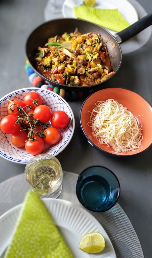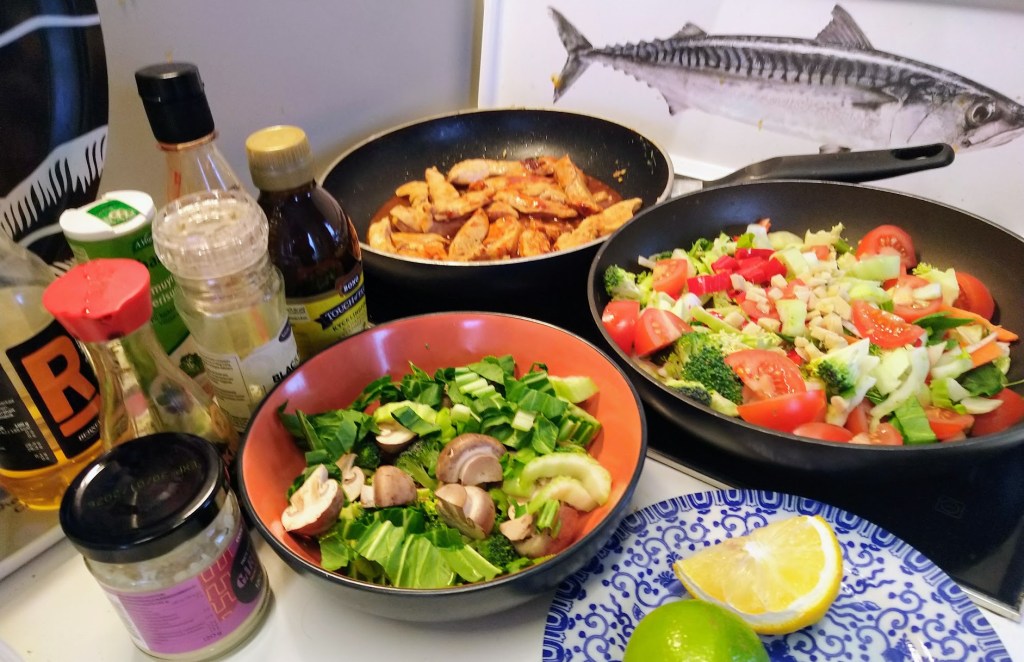 Kauden teema on ollut lisätä kasviksia ruokavalioon. Innostuin kokkaamaan värikkään vokin. Pilkoin ainekset, kuullotin hyvässä oliiviöljyssä ja maustoin aasiatyyliin. Siis soijakastiketta, valkosipuli- ja chilitahnaa, kalakastiketta sekä puristettua limeä.