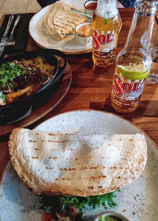 Valitsimme kanatäytteisen ja toiseksi katkaraputortillan sekä pullolliset Sol-olutta. Annokset olivat sopivan tulisit ja olut kylmää. Palasimme hotellille hetkeksi lepäämään, sillä illaksi oli ohjelmaa.