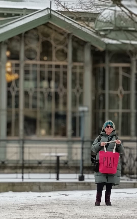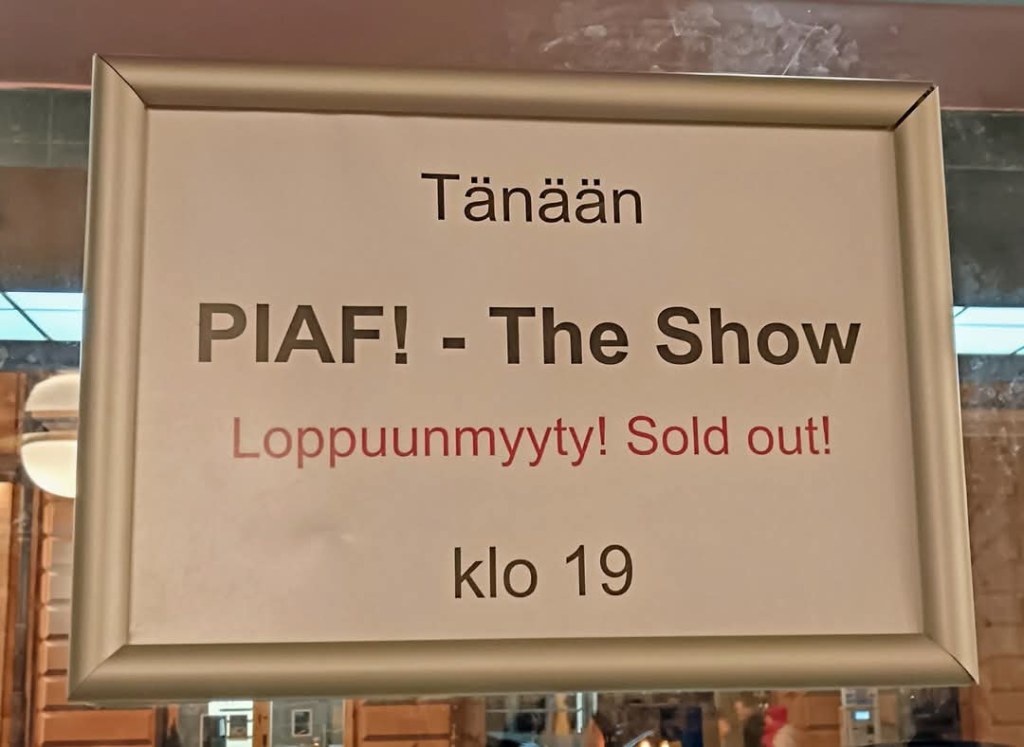 Paikkamme olivat parvella, josta oli kohtalaisen hyvä näkyvyys lavalle. Kielitaitoinen sisko turhautui ensimmäisen näytöksen aikana, kun Edithin tarina kerrottiin vain ranskaksi. Laulut sen sijaan koskettivat. Toinen näytös oli yhtä juhlaa, nyt kuulimme kaikki tutut klassikot. Upeaääninen ranskalaislaulaja Nathalie Lermitte tulkitsi antaumuksella Piafin lauluja viisimiehisen orkesterin säestyksellä. Olimme häikäistyneitä. Ostin siskolle syntymäpäivälahjaksi punaisen Piaf-kangaskassin, johon solisti kirjoitti signeerauksen.