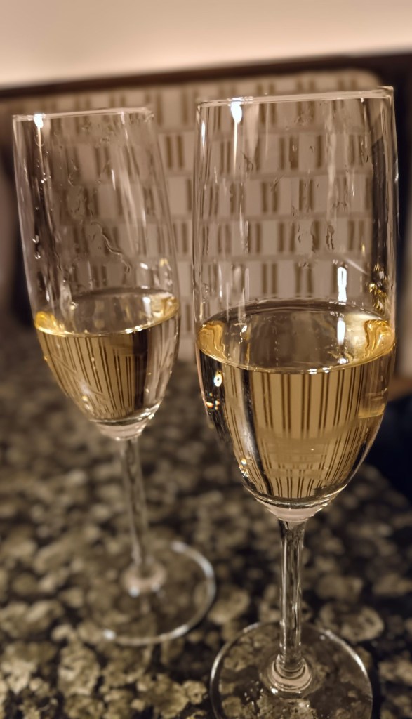 – Matkan ensimmäiset kuohuviinit, mutta ei taatusti viimeiset, kohotin lasin ja kilistin siskon kanssa.