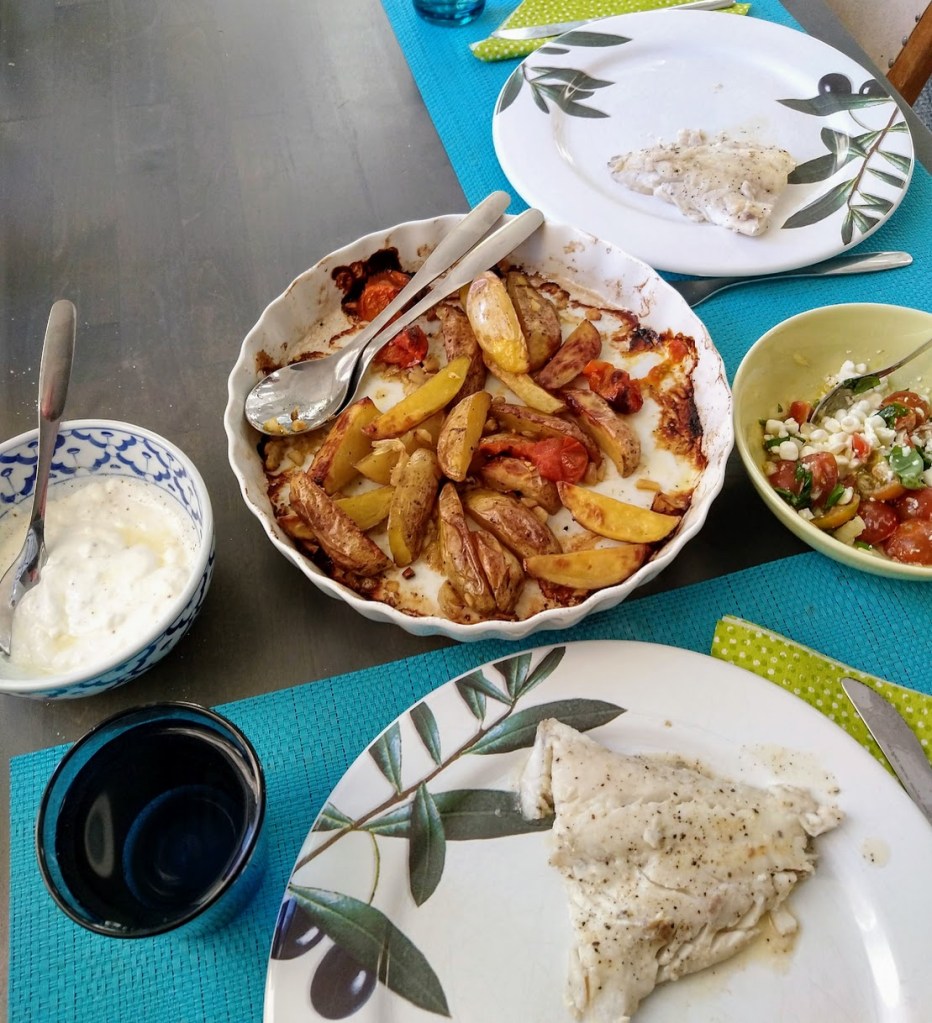 Yritimme uudelleen ja nyt saimme yhteisvoimin uunin pelittämään. Perunat kypsyivät ja kala oli rapeaa.