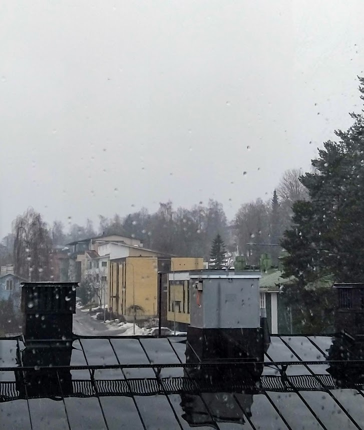 Tihkusadetta, harmaata, masentavaa, tässä aamun tunnelmat. Onneksi ei ole pakollisia menoja. Hiihtolomalaisilla on kurjaa, kun kunnon talvesta ei ole tietoakaan.