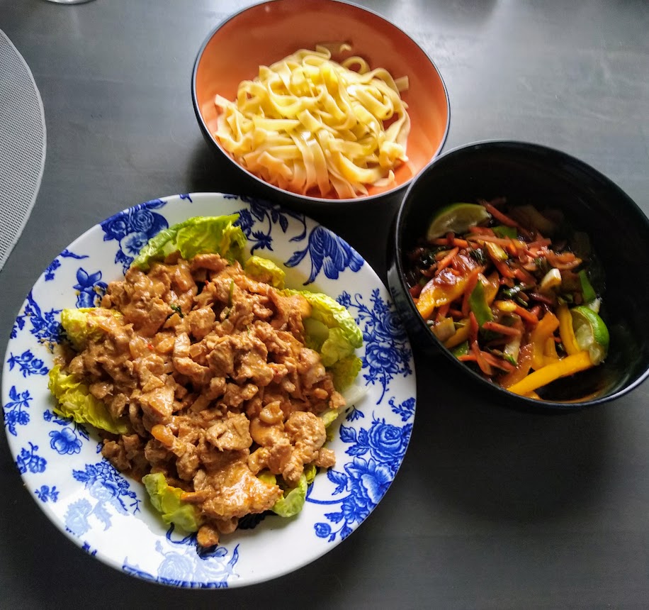 Arkinen kotikokkaus jatkuu. Maustoin broilerisuikaleet reippaasti. Soijakastiketta, valkosipulia, tuoretta inkivääriä, kanafondia, paprikajauhetta, yrttisuolaa, mustapippuria ja limenmehua sekä ripaus chiliä ja kuohukermaa. Kypsensin pannulla. Kuullotin thaikasvissekoituksen toisella ja keittelin tagliatellia lisukkeeksi.