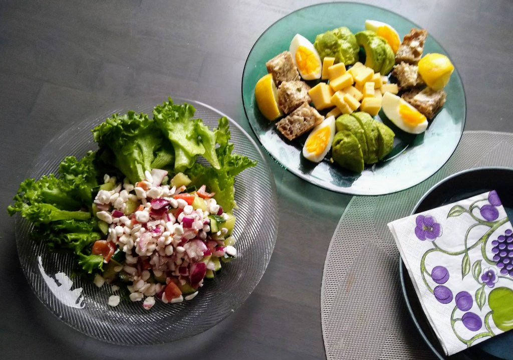 Kokkasin päivällä kevytruokaa kahdelle. Tomaattisipulisalaattia, avokadoja, kananmunan puolikkaita, juustoa ja vielä jälkiruoaksi terveelliset mustikkasmoothiet.