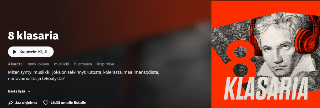 Löysin siskon vinkistä Yle Areenasta hurmaavan podcastin 8 klasaria. Kahdenkymmenen minuutin jaksoja on enemmänkin ja mikä parasta, aina voi valita kiinnostavimmat. Olen ollut jo Beethovenin, Vivaldin ja Debussyn lumoissa.