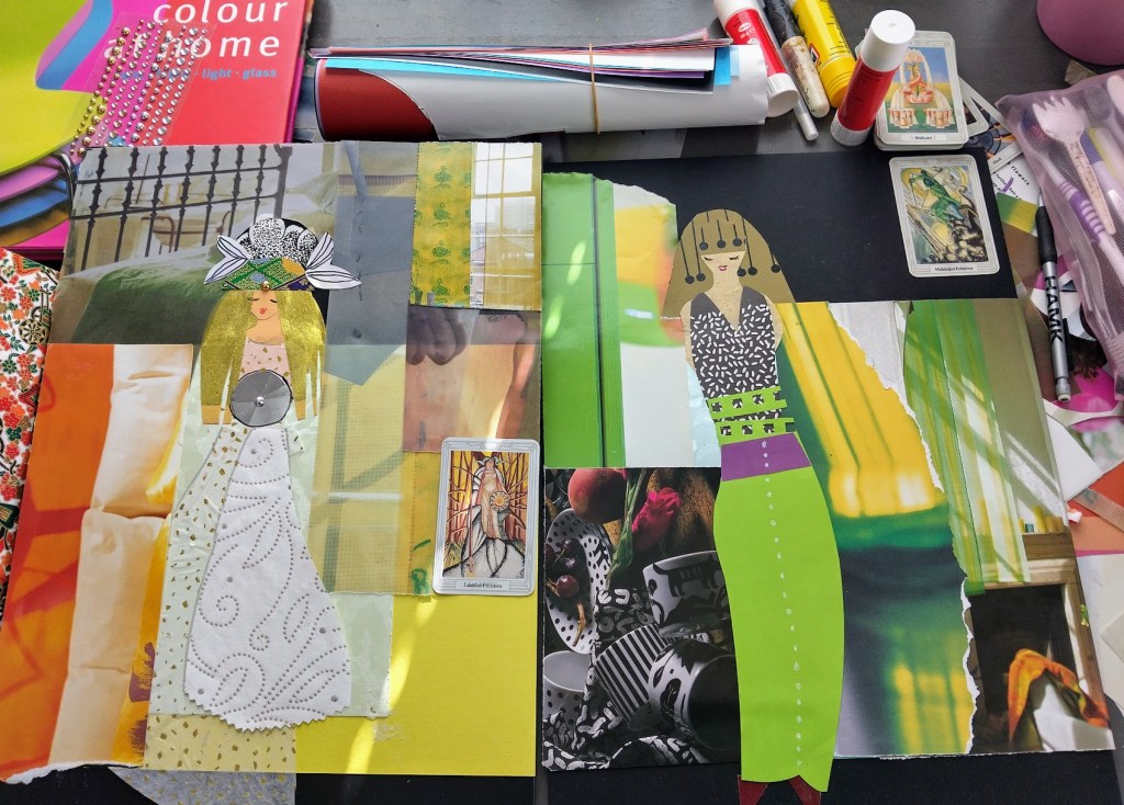 On minulla silti ilonaiheita, sillä innostuin pitkästä aikaa sommittelemaan tarotkorttien innoittamia kollaaseja. Löysin joskus aloittamani prinsessat, joihin en ollut tyytyväinen. Ainekset olivat kuitenkin käyttökelpoisia ja kaipasivat vain päivitystä. Mikä ilo olikaan ottaa taas kerran kaikki ihanat askartelutarvikkeet käyttöön. Jopa liimapuikot toimivat, vaikka edellisestä kerrasta oli aikaa. Hyvä minä.