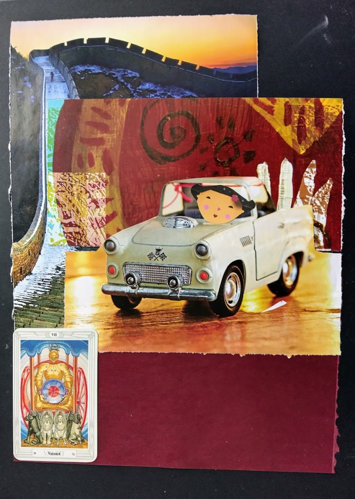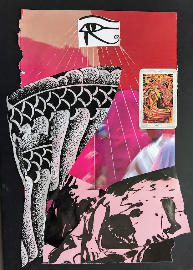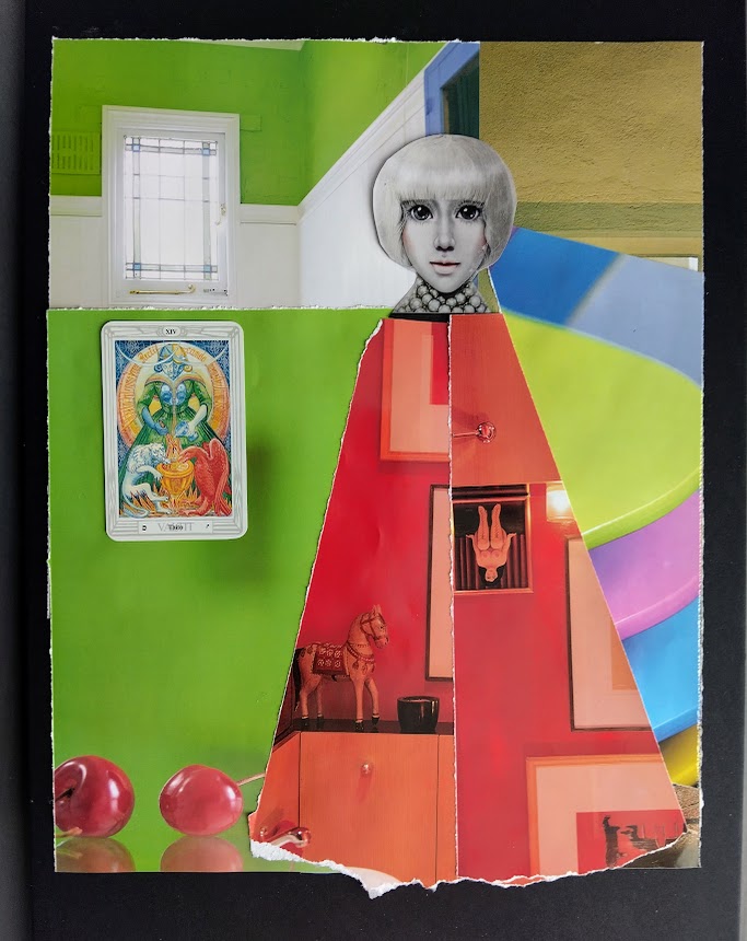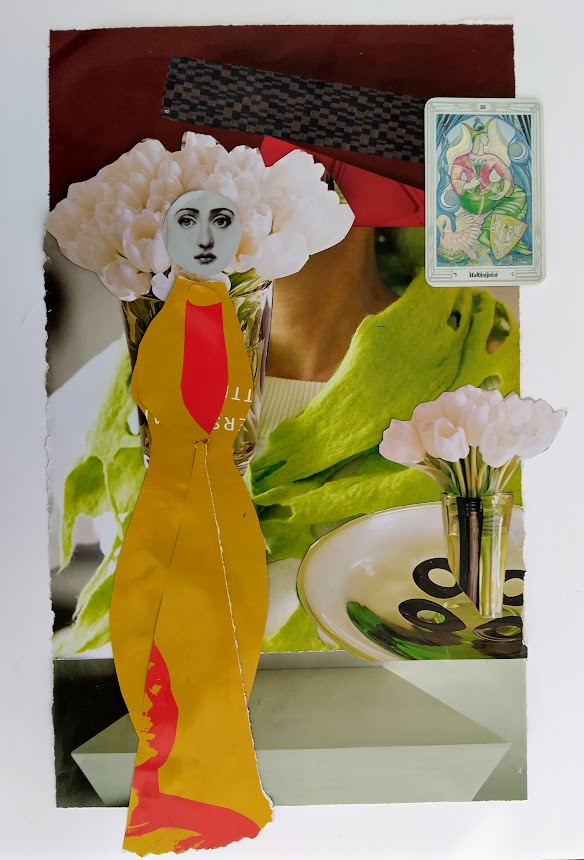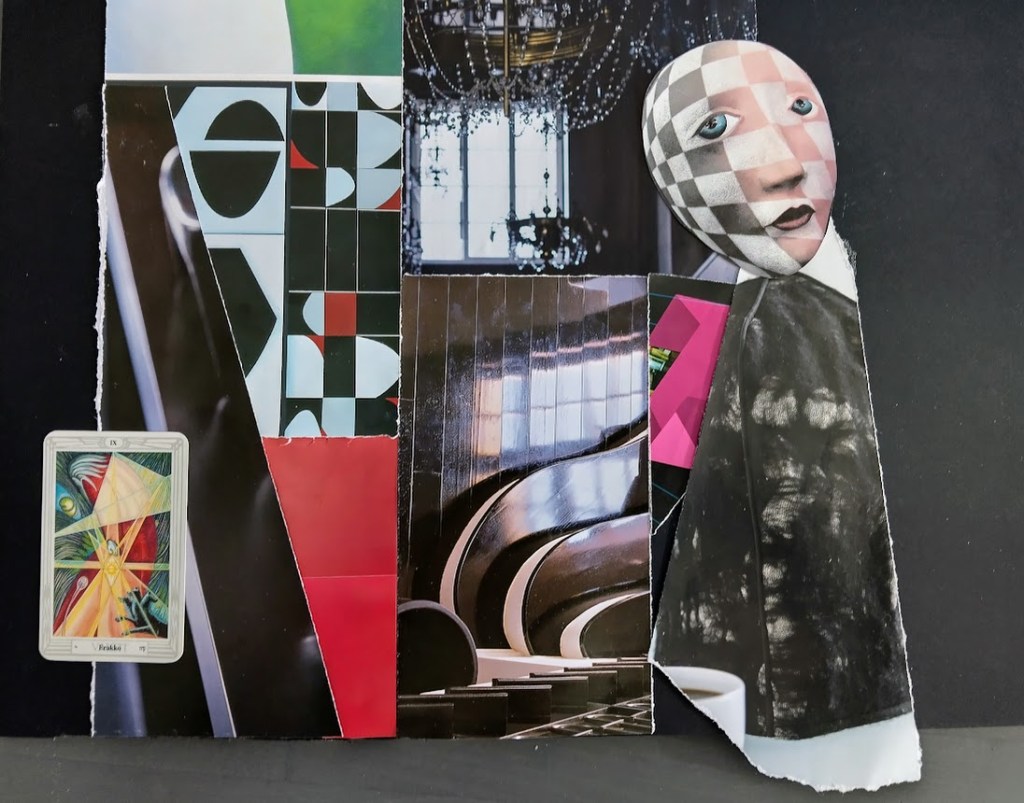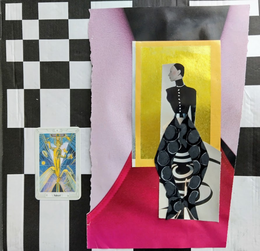Kollaasiaskartelu hovikorttien prinsessojen parissa oli esteettistä. En edes kuvittele ikuistavani prinssejä tai ritareita. Eksyin kauas mukavuusalueelta, kun ryhdyin sommittelemaan Narria ja Taikuria. Otin jo viime kesänä talteen ruutukuvioisia pizzalaatikoita. Arvelin, että niille tulee vielä käyttöä.