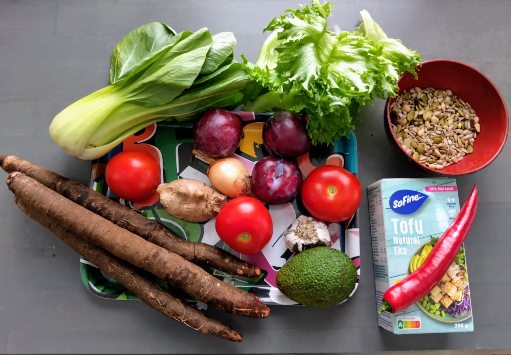 Ilahduin, kun näin lähikaupassa mustajuuria. Olen kokannut niistä ennenkin lämmittävää keittoa, mutta siitä on aikaa. Ostin myös rehevän paksoin ja tofua.