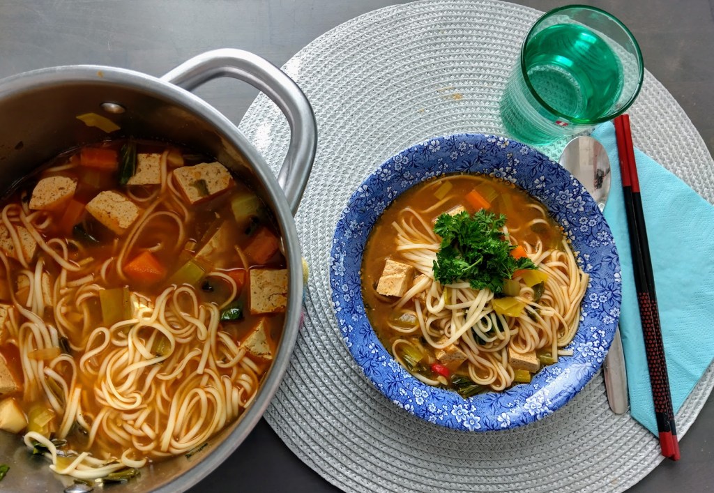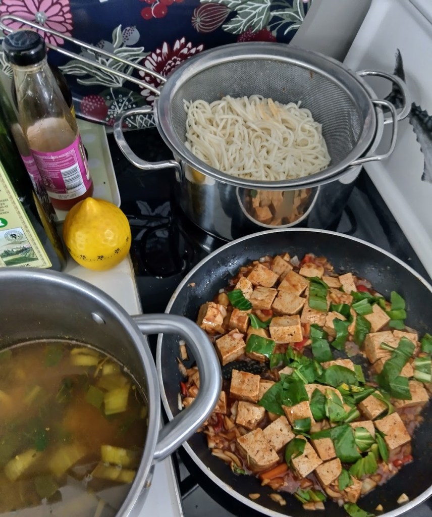 Keittelin kasvisliemen, johon lisäsin purjoa ja paksoita sekä misotahnaa. Marinoin tofukuutiot soija- ja chilikastikkeilla ja lisäsin pannulle hienoksi pilkottua valkosipulia, punaista chiliä ja inkivääriä.