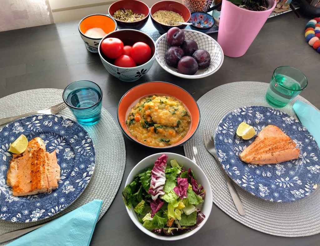 Herkuttelimme siskon kanssa pitkästä aikaa kalalla. Ostin taimenfileen ja kokkasin kaveriksi terveellisen juuresmuhennoksen. Käytin väripilkkuna tuoretta luomupinaattia.