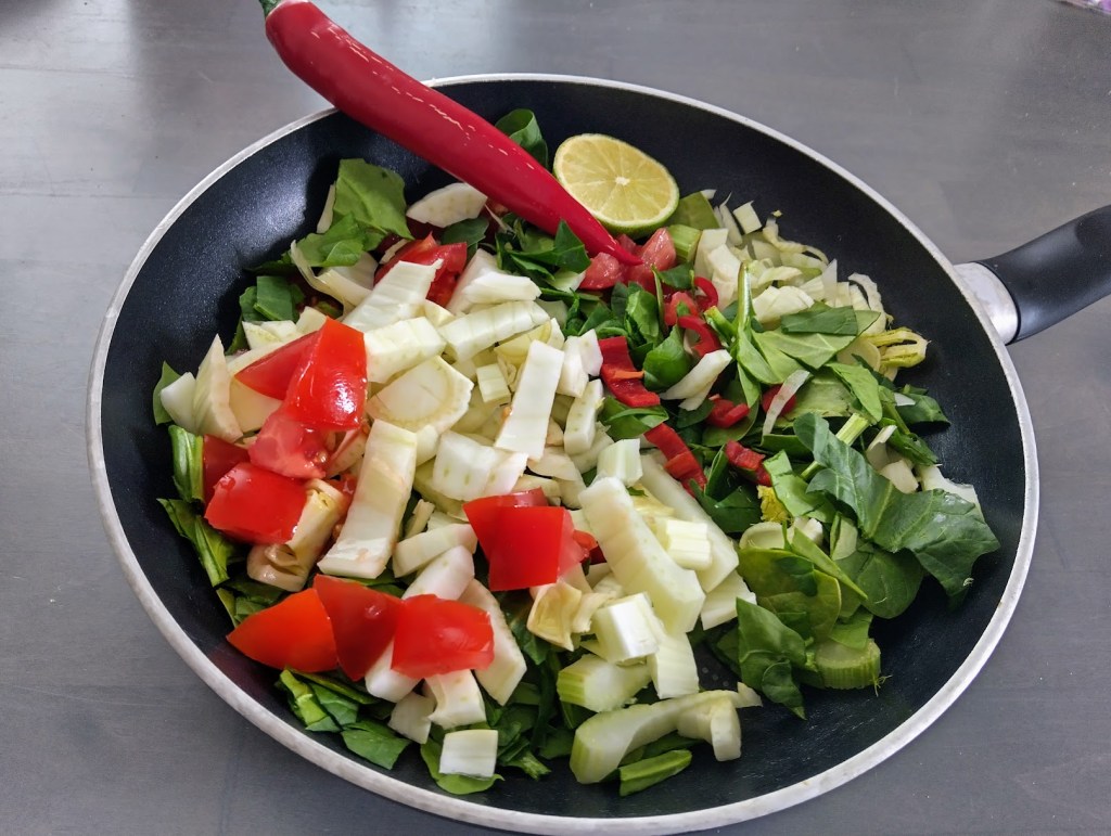 Seuraava kokeilu oli paahtaa fenkolin siivuja, tomaatteja, tuoretta pinaattia, punaista chiliä ja tomaatteja pannulla. Maustoin yrttisuolalla ja soijakastikkeella. Toimi hyvin lisukkeena.