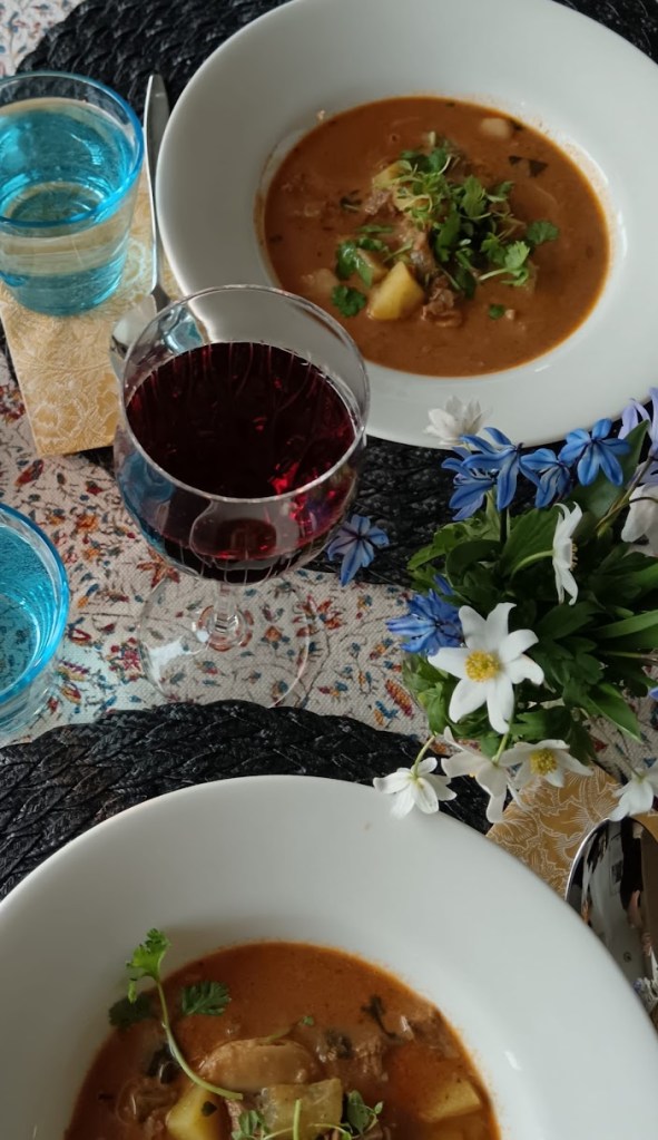 Oli ylellistä istahtaa herkkulounaalle Jaanan luo. Hän oli taikonut lampaan potkista maukkaan keiton. Vielä ylellisempää oli, että sen kanssa oli tarjolla viiniä. Siskon mukaan lammasta ei voi kokata ilman punaviiniä!