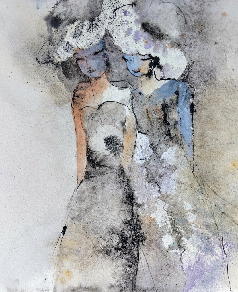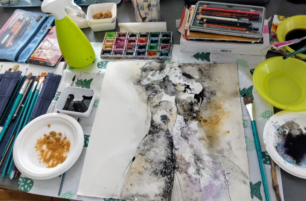 Osallistuin vuosia sitten akvarelli- ja tussikurssille Leppävaarassa. Vesiliukoinen tussi on edelleen yksi suosikeista. Tavoittelen pelkistystä ja samalla esteettisyyttä koristeellisten pintojen avulla.