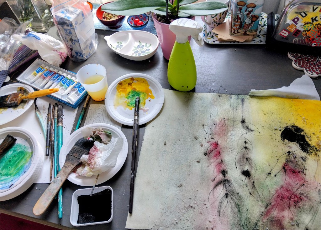 Olen viettänyt rattoisia hetkiä kollaasien ja akvarellien parissa. Tavoitteet eivät ole korkealla, nautin vain tekemisestä. En aina itsekään tiedä, mitä seuraavaksi on tulossa.