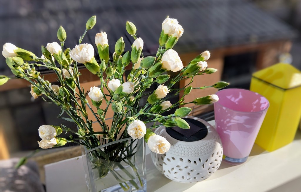 Viikonloppu vapun jälkeen on sateinen ja kolea. Kävin kaupassa ja totesin, että tämän päivän ulkoilu oli siinä. Olin suunnitellut ostavani tulppaanikimpun silmän iloksi, mutta niitä ei enää ollut. Ilmeisesti kausi on ohi. Ostin terttuneilikoita, kauniita ja kestäviä nekin.
