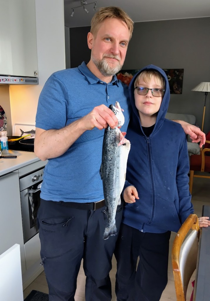 Päivä on ollut suloisen lämmin. Herkuttelimme siskon kanssa Miikan graavaamalla lohella. Paistoin yllätysjälkiruoaksi muutaman letun. Parasta kaikesta, parvekkeella tarkeni.