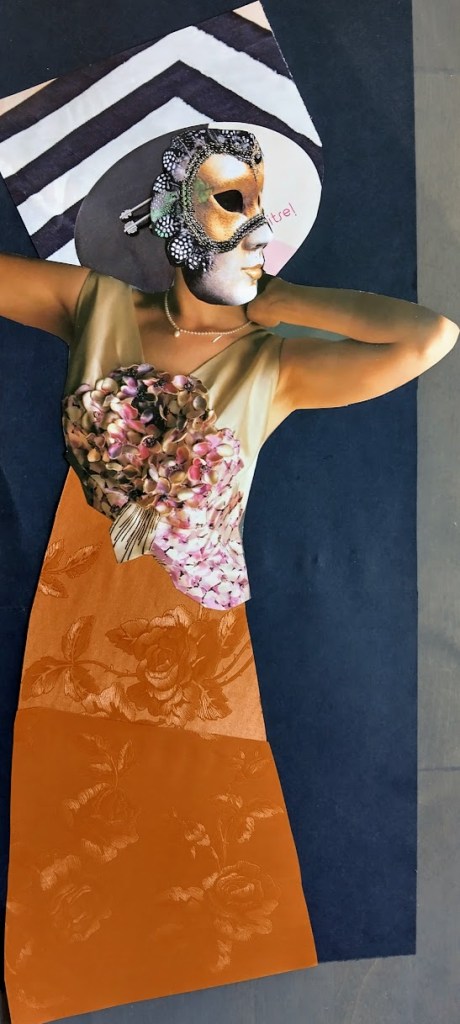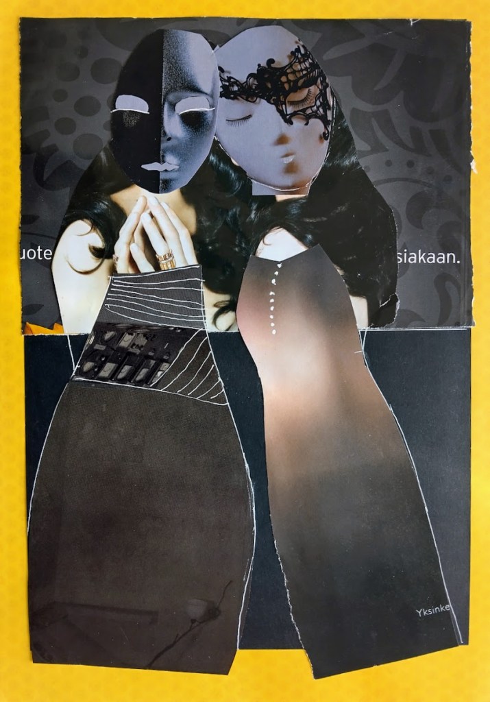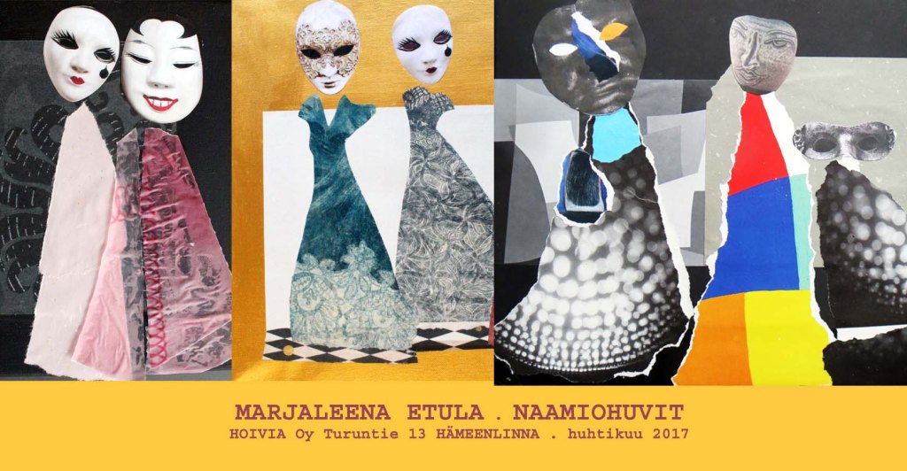Kotoa löytyy jatkuvasti aarteita. Olen kerännyt vuosien varrella kollaasimateriaalia, josta on edelleen iloa. Nyt vuorossa on sarja printtaamiani naamioita. Mitä niistä syntyy, odotan jännittyneenä.