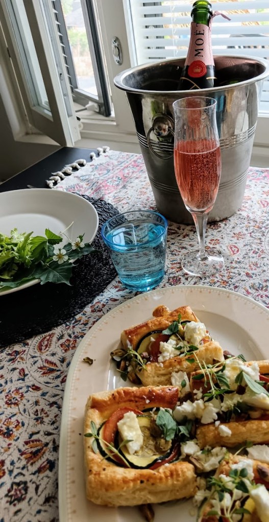 Tarjoilukin oli viimeisen päälle, aitoa samppanjaa ja mehevää ranskalaisen keittokirjan ohjeen mukaan paistettua kasvispiirakkaa. Jälkiruoaksi tuoreita mansikoita. Sisko kiittää. Päivä oli ylellinen.