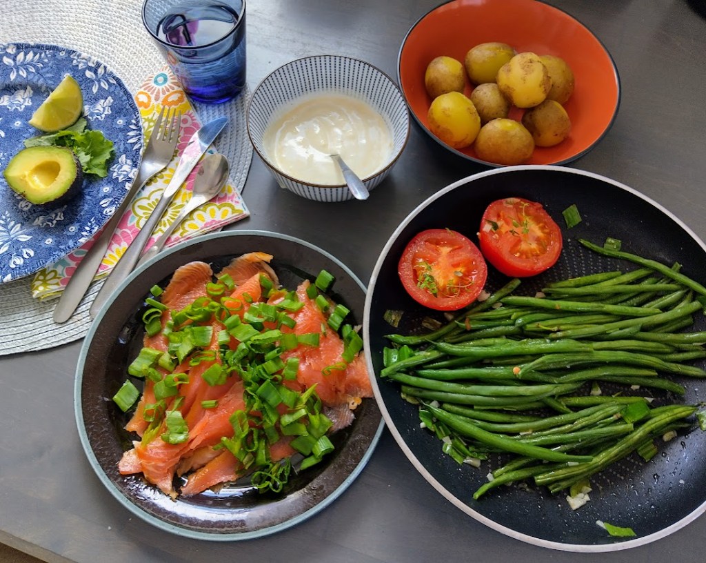 Kevytruokailu on terveellistä ja maistuvaa varsinkin hellepäivinä. Tarjosin lounaaksi varhaisperunoita, kylmäsavulohta ja kasviksia. Kaikki maistui kesältä.
