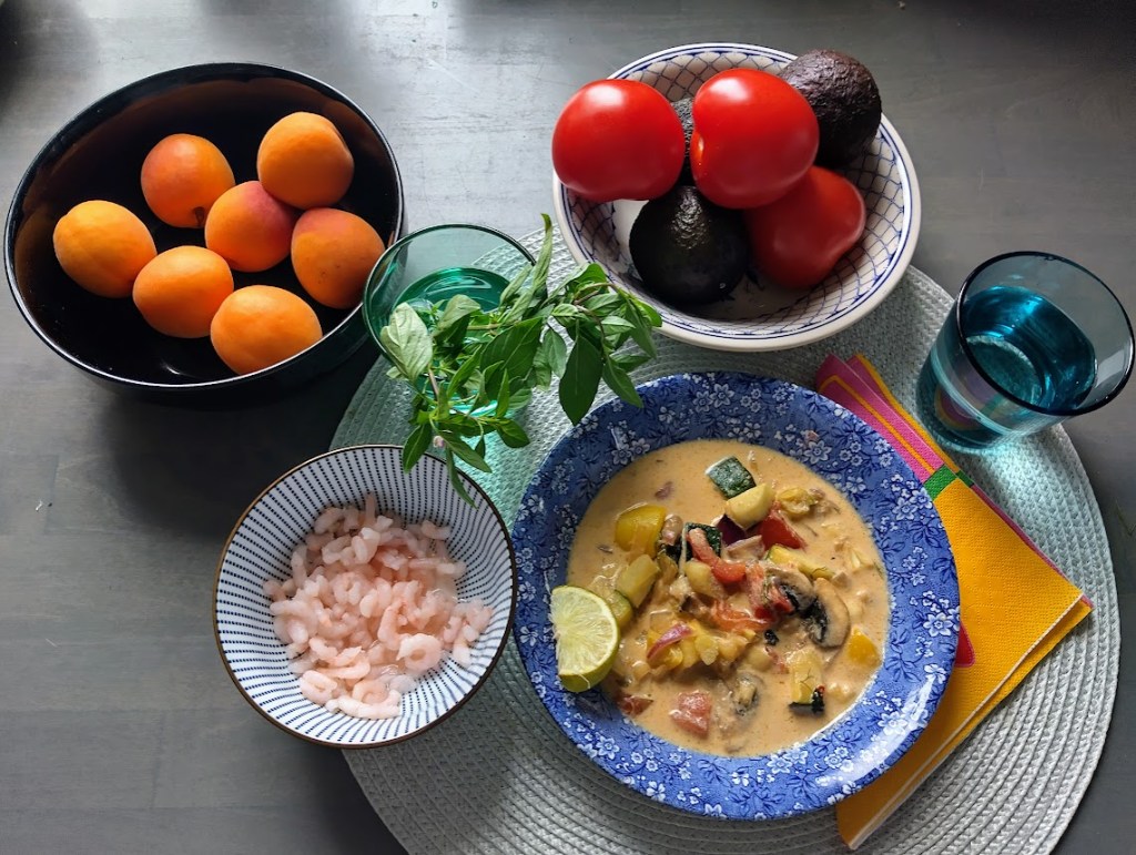 Kokkasin koleiden ja sateisten päivien johdosta lämmittävää tulista kookosmaitokeittoa. Siihen tuli raasteiden lisäksi punasipulia, paprikoita, kesäkurpitsaa, fenkolia ja herkkusieniä chiliä unohtamatta. Siskon parvekkeelta löytyi thaibasilikaa. Keitto oli lohturuokaa parhaimmillaan. Tarjosin katkaravut erikseen limen kera.