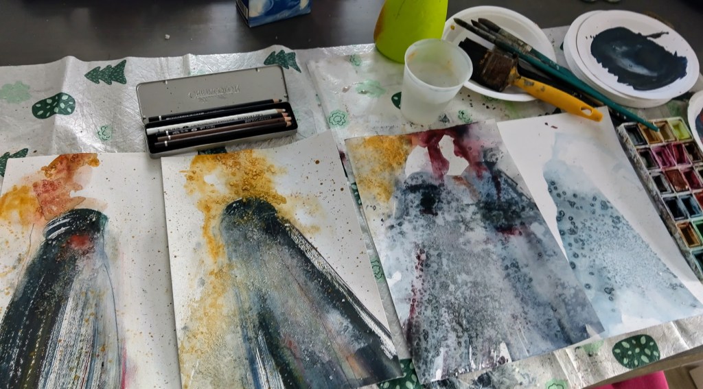 Yllätin itseni ottamalla pitkän tauon jälkeen akvarellitarvikkeet esiin. Keittiön pöytä on vallattu, hyvä niin!