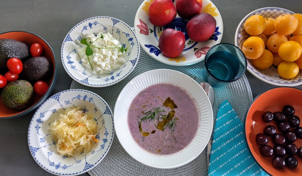 Heinäkuussa alkanut helleputki ei näytä loppuvan. Lämmin ruoka ei maita, mutta syödä ja juoda pitää. Olen kokannut salaatteja ja keveitä keittoja velvollisuudentuntoisesti.
