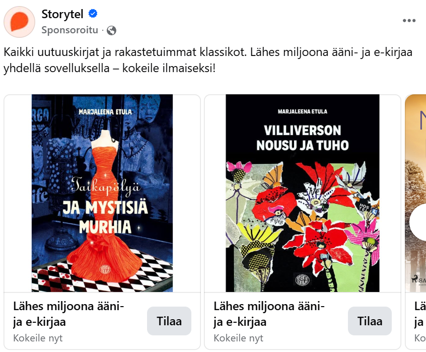 Selasin facea ja hämmästyin, kun silmiin osui Storytelin mainos. Siis oikeasti, omat kirjathan sieltä pilkistivät! Jos joku on kiinnostunut hankkimaan Taikapölyn kirjana, minulta saa edullisesti omistuskirjoituksella varustettuna. Villiversosta on tehty vain e-kirja.