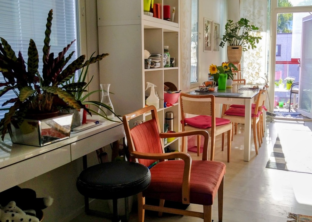 Katselen ympärilleni. Pieni kaksioni kiiltelee puhtaana, siitä ihana Katri käy pitämässä huolta kerran kuukaudessa. Se on ylellisyyttä, mutta myös terveyskysymys. En todellakaan enää kiipeile enkä pese ikkunoita. Parvekelasit kirkastuivat kesän kynnyksellä. Viihdyn ulkona hyvällä säällä. Kukatkin viihtyvät, kun muistan kastella niitä.