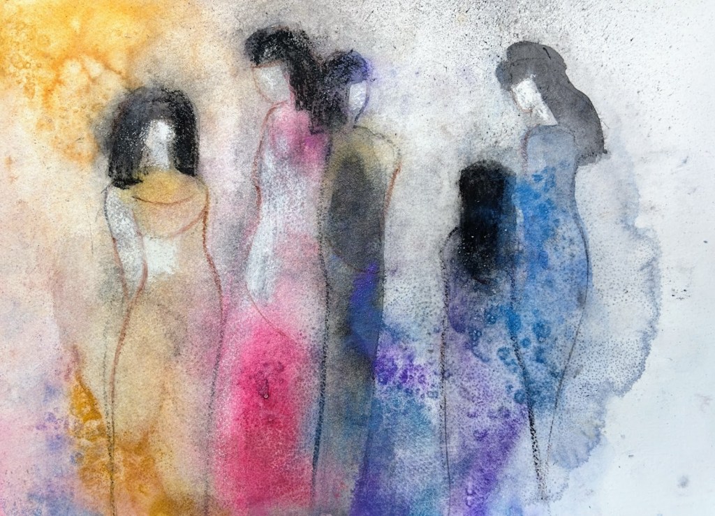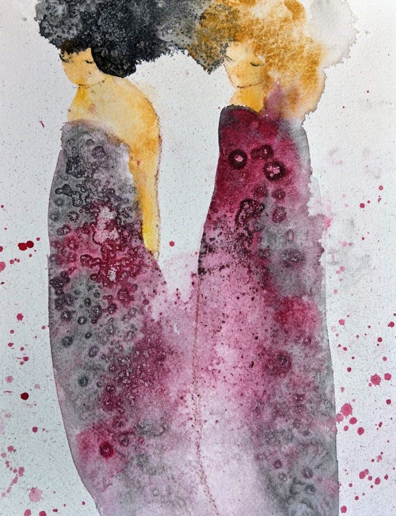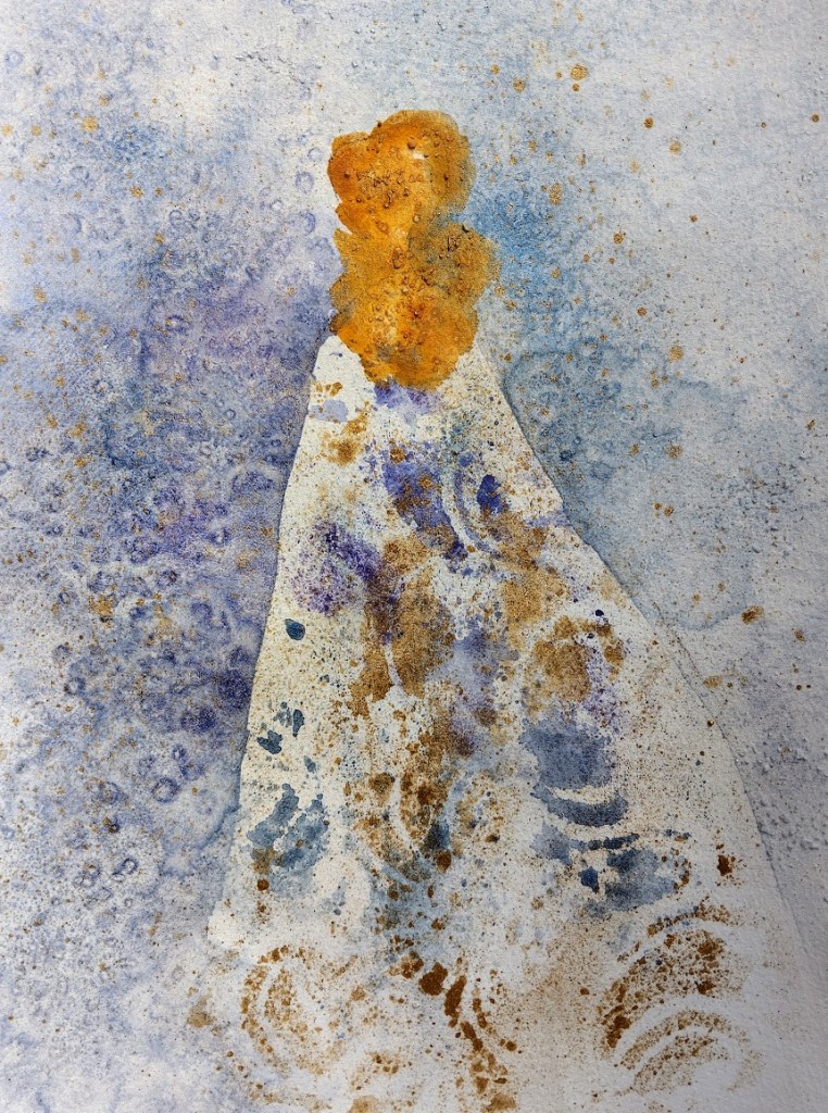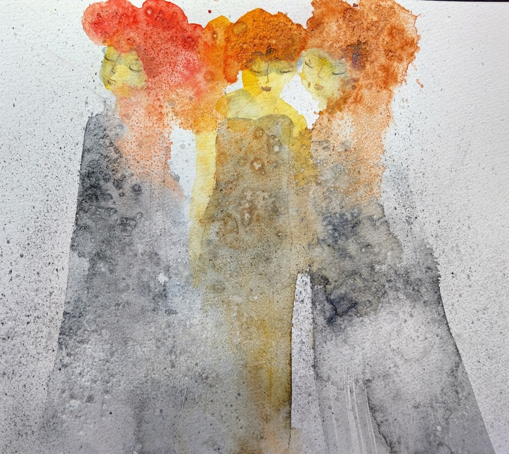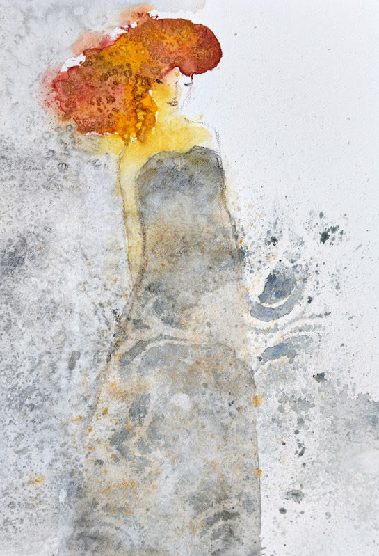 Olen jatkanut kollaasihulluttelun jälkeen akvarellien maalaamista. Koska olen viikon yksin ilman ruokavierasta (siis siskoa), levittäydyin keittiön pöydän ääreen. Tarvikkeet ovat sopivasti esillä, jotta voin maalata ohuita kerroksia ja laittaa kosteat työt kuivumaan parvekkeelle. Aurinko ja tuuli ovat oivia vauhdittajia.