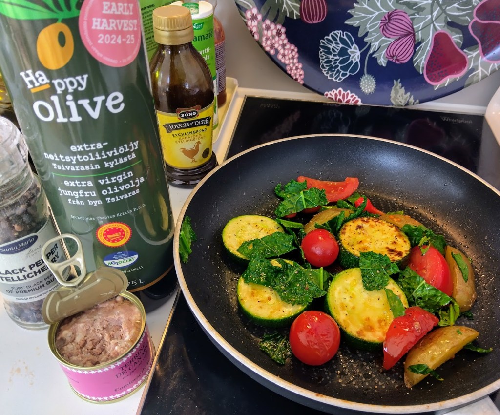 TULIAISISTA JA KOTOA LÖYTYNEISTÄ KASVIKSISTA SYNTYI HERKULLINEN PAISTOS, LISÄNÄ JAANAN RANSKANMAALTA TUOTUA HANHENMAKSAA VIHERPIPPURIN KERA