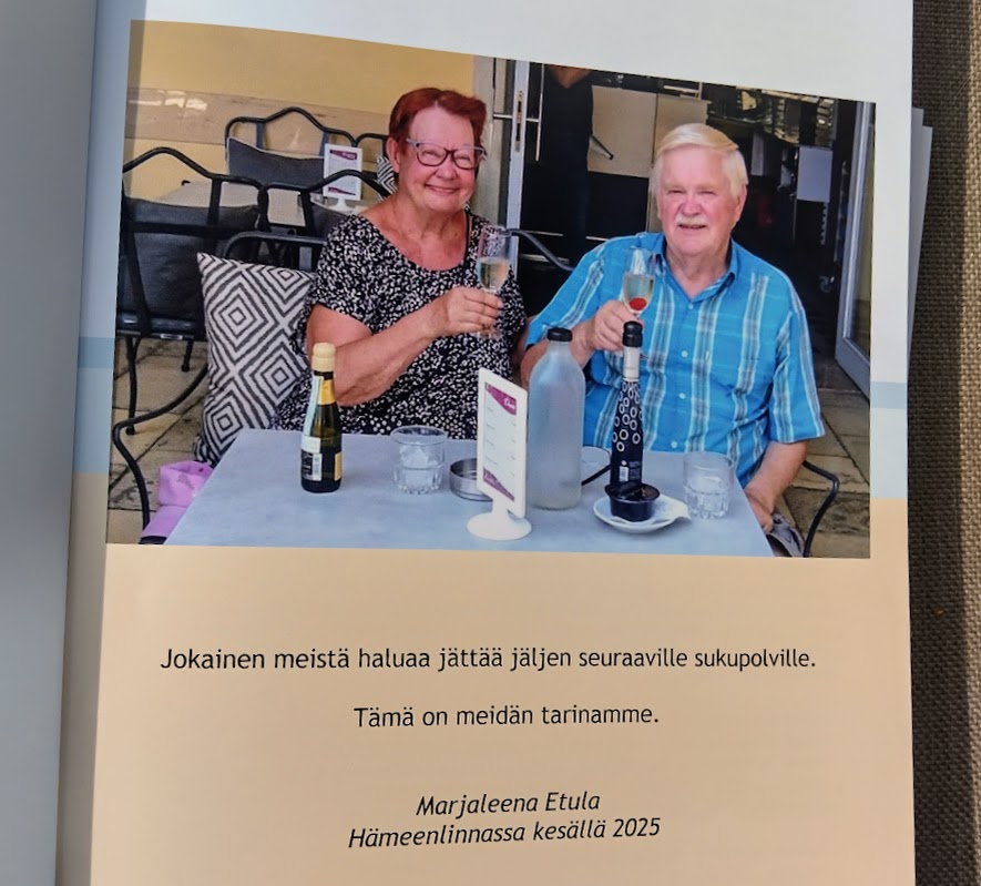 Näin tein, mutta tarinan toinen puoli jäi vaivaamaan. Kirjoitin sen uusiksi ja päivitin kotisivuilleni. Halusin myös painotuotteen, en julkista, vaan omaksi ja toivottavasti joskus myös lasten ja lastenlasten luettavaksi. Mummin ja papan tarina alkoi 1970-luvulla ja kesti yli 50 vuotta. Teetin laadukkaan Ifolor-kirjan, jossa on peräti 120 sivua. Sivuilta löytyy valokuvia onnellisista hetkistä.