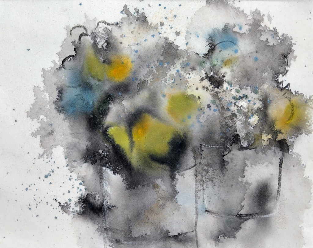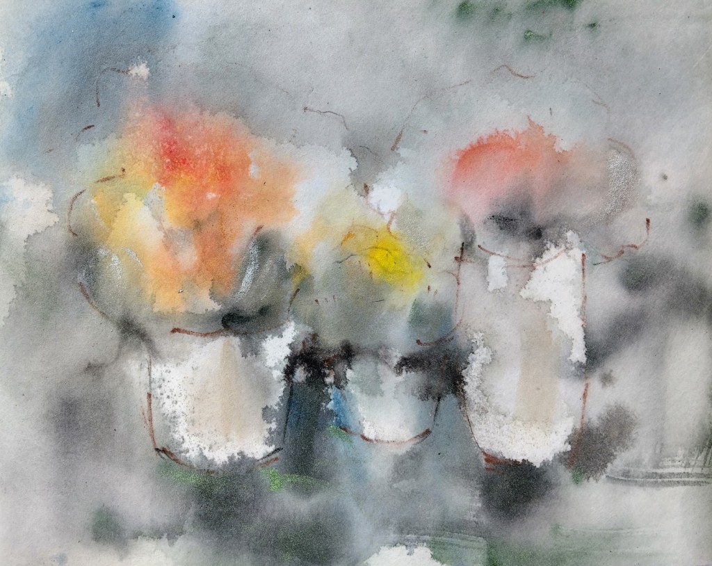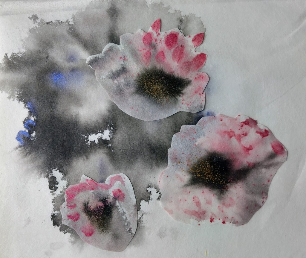 Kokeilin myös kollaasitekniikkaa, mutta kukat näyttivät päälle liimatuilta. Sitähän ne olivat.