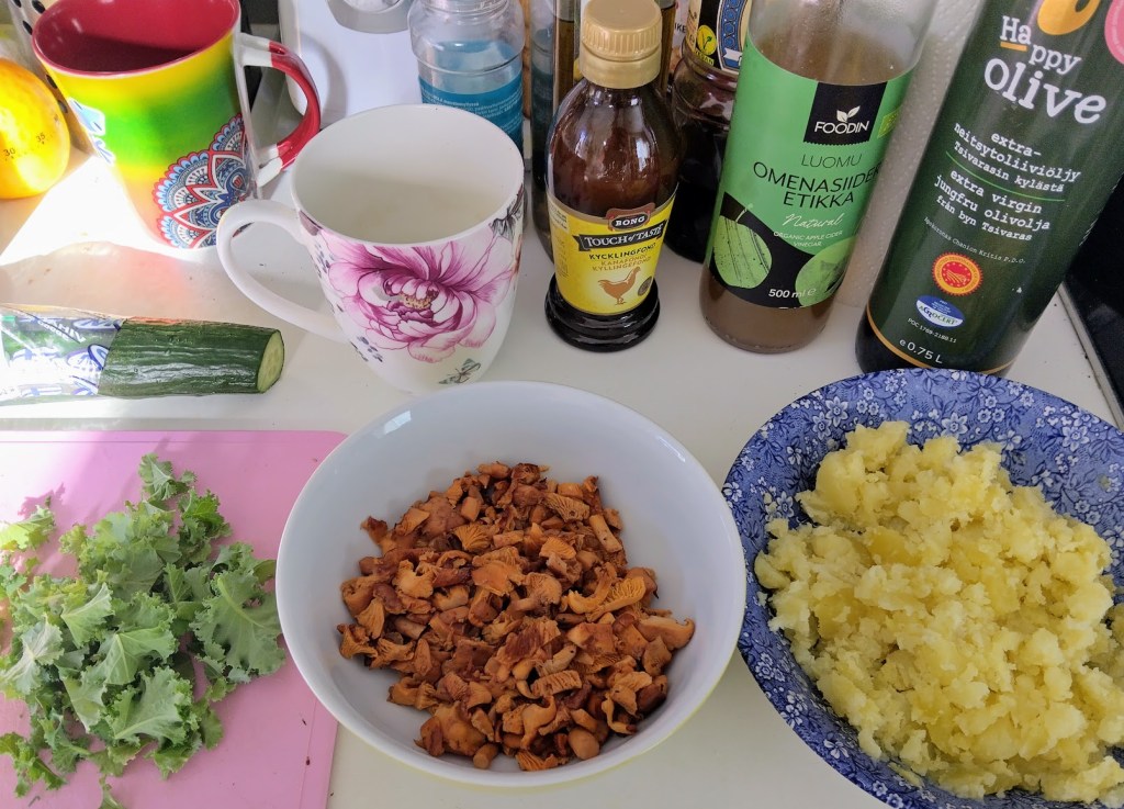 TARJOLLA SALAATTIA, KANTARELLIKASTIKETTA (KIITOS NUORISON SIENIRETKEN) JA JUURESMUHENNOSTA