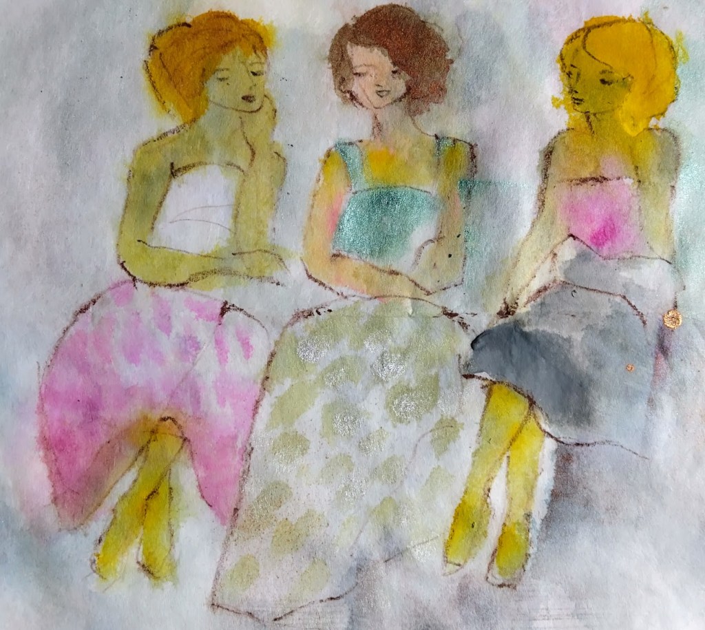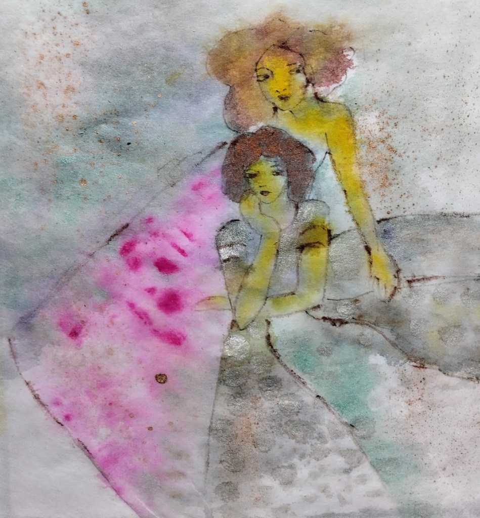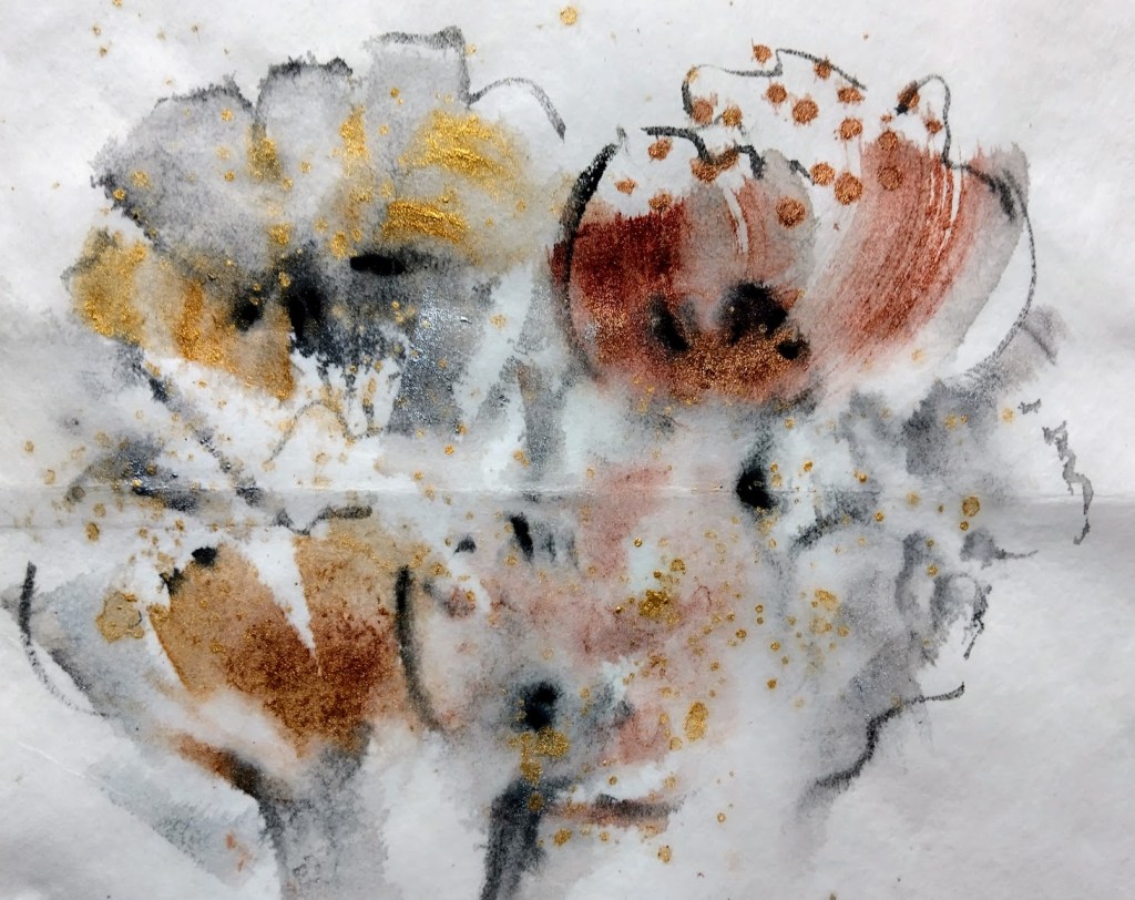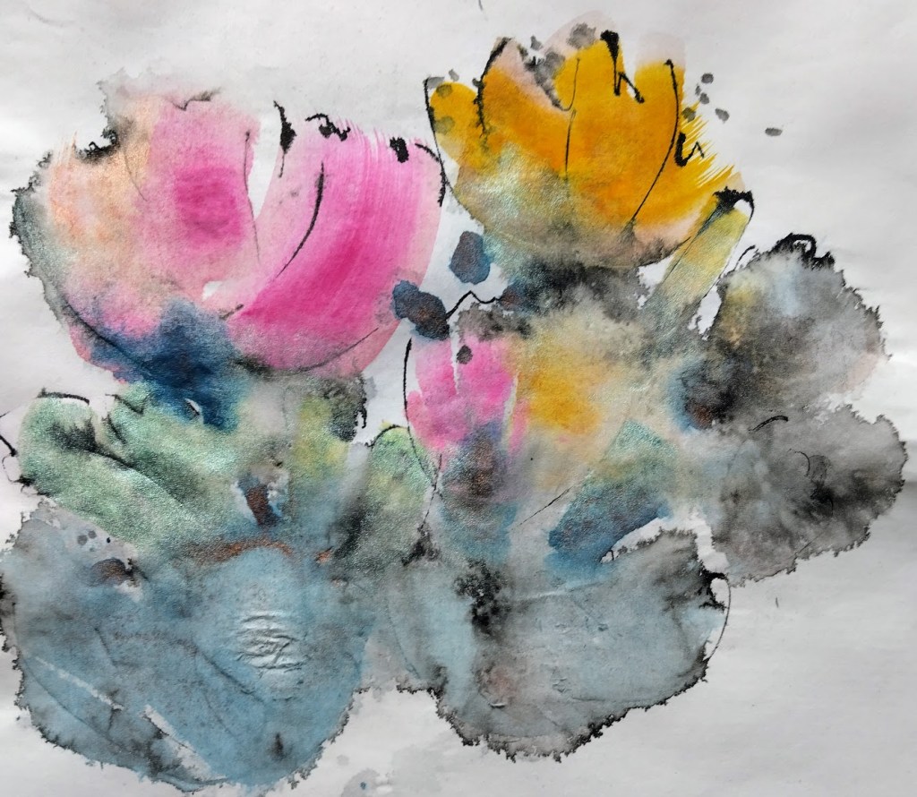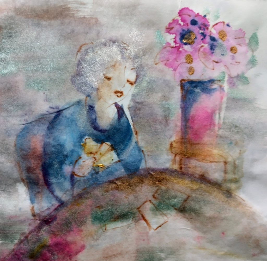 Päivälläkin tarvitsee sähkövaloa, eletäänhän nyt marraskuuta. Lunta ei ole vielä saatu, kelit jatkuvat harmaina ja kosteina. Kollaasikipinän jälkeen siirryin taas vesiliukoisiin väreihin.