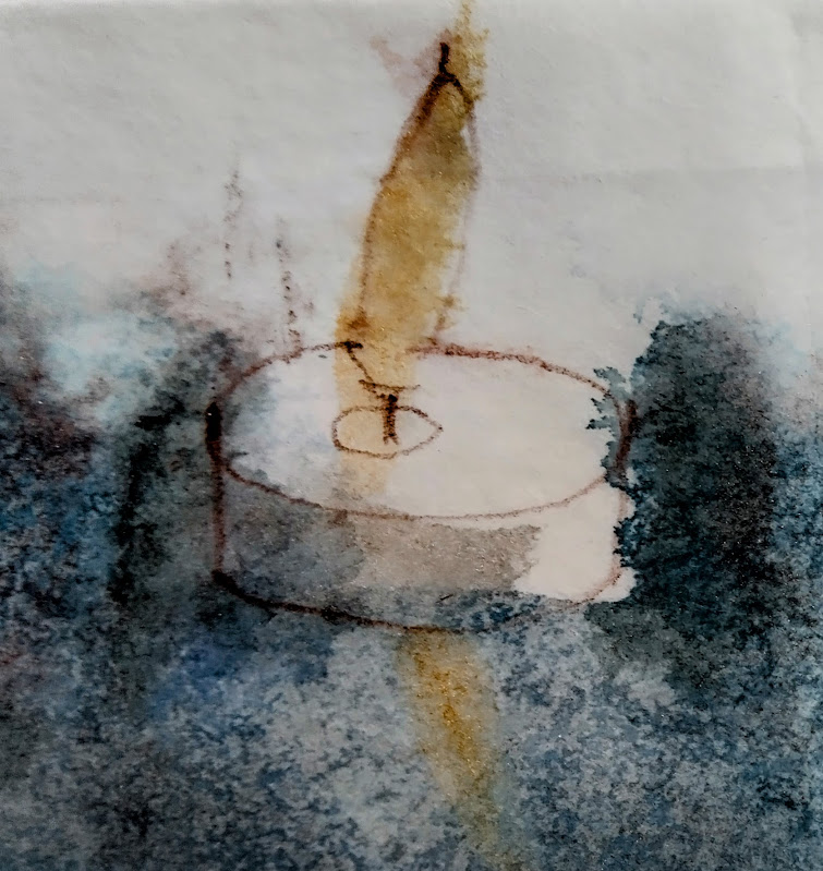 Istuin kaikessa rauhassa tietokoneen ääressä kun kuulin rysäyksen. Olin kiinnittänyt kehystetyn akvarellin tarrakoukulla kylpyhuoneen laatoitukseen. Aikansa se kesti. Päätti sitten irrota isänpäivänä.