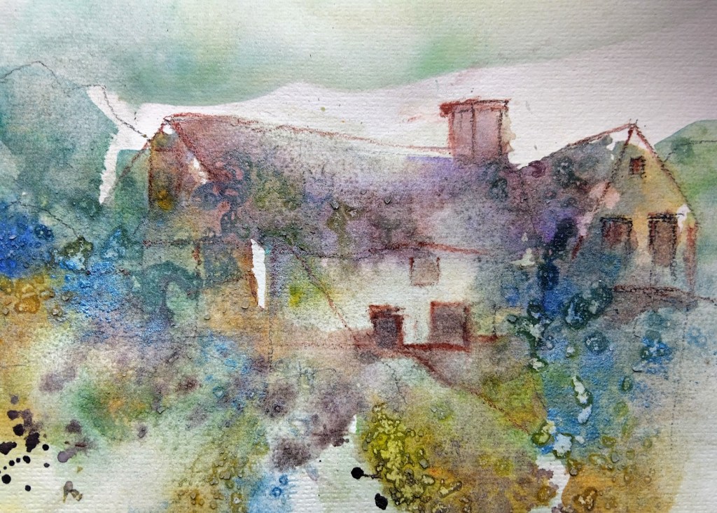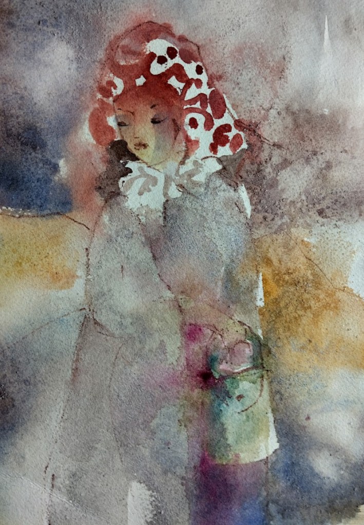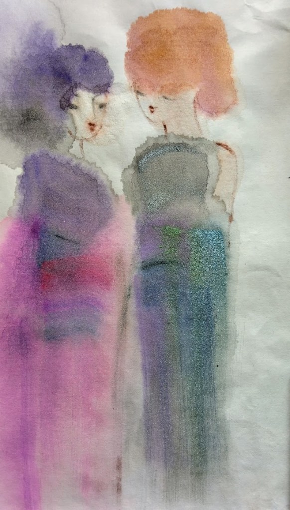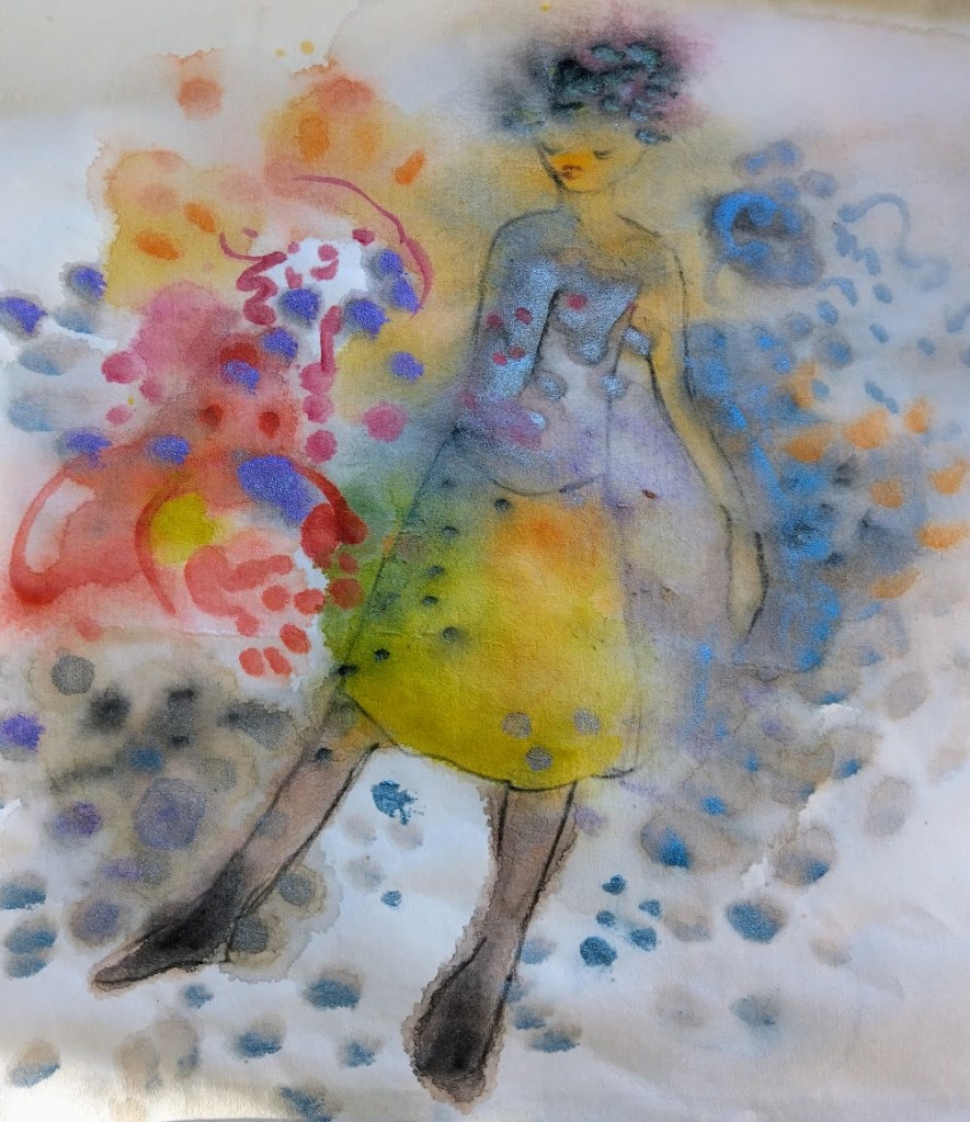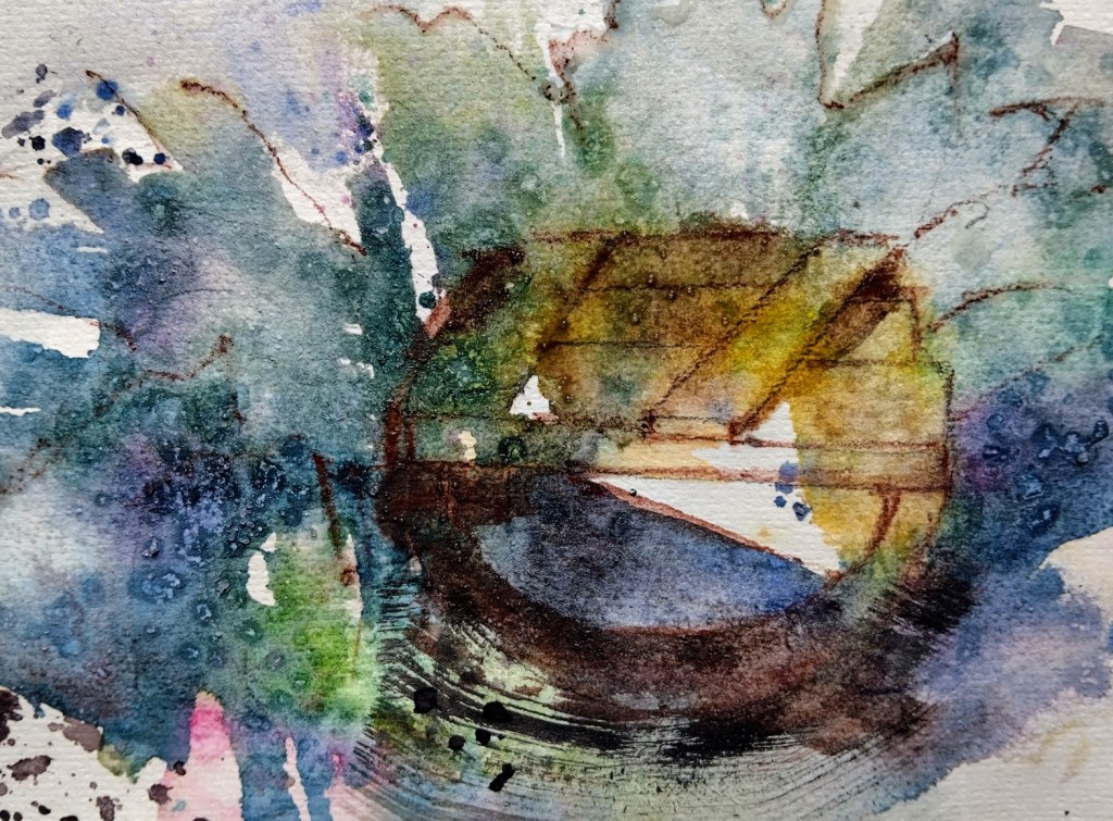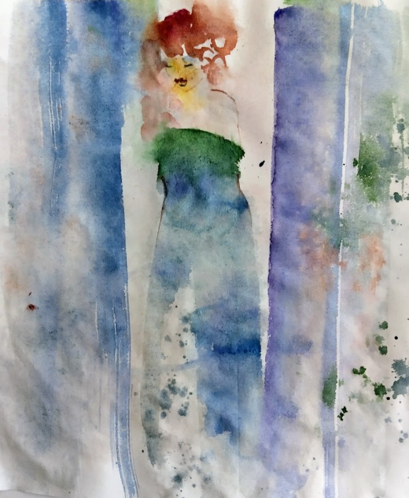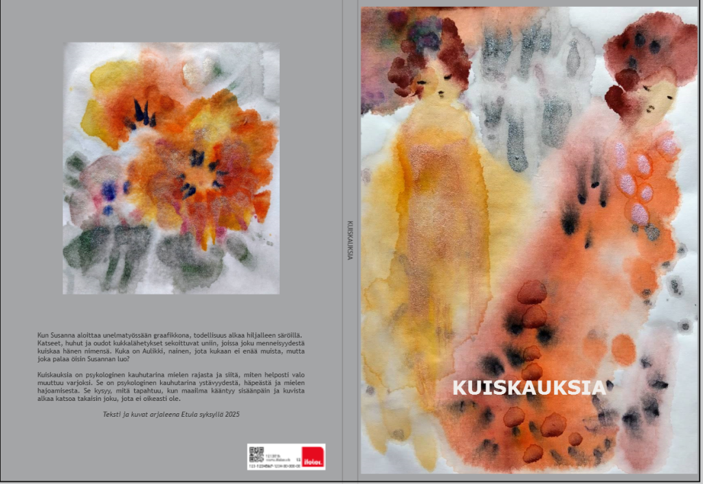 Tarinan taustaa: Olen kokeillut maalata akvarelleja erilaisille ei perinteisille materiaaleille kuten ohuelle kuitukankaalle ja muovitetuille pinnoille. Se on ollut kiehtovaa ja toisaalta turhauttavaa. Varsinkin muovi, sillä hyväkin työ menee pilalle, jos materiaali kupruilee ikävästi. Olen koonnut maalauksista pieniä kirjoja tarinoiden kera. En tiedä, mikä sai minut kirjoittamaan kauhukertomuksen. Se on uusi aluevaltaus, olen hämmästynyt itsekin. Tosin mystiikka on kiehtonut, mutta tällä kerralla tarinan loppu ei ole onnellinen. Vai onko sittenkin?
