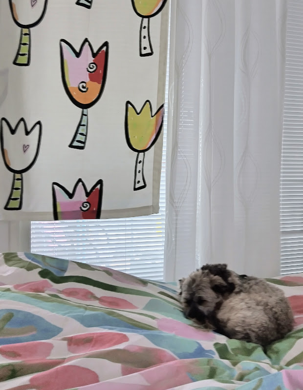 Kotihiiren päivät sujuvat leppoisasti. Totta kai ulkoilen, pihapiiri on laaja ja tasainen. Jääkaappi on harvinaisen täysi kauppatilauksen jäljiltä. Lupasin kokata siskolle ja itselleni ainakin viikon. Jaana on tulossa kahden viikon Afrikan matkalta tänään. Keittiön pöytä näyttää olevan pysyvästi maalauspöytä, mutta se on onneksi niin iso, että saan helposti raivattua tilaa myös kahden hengen lautasille.
