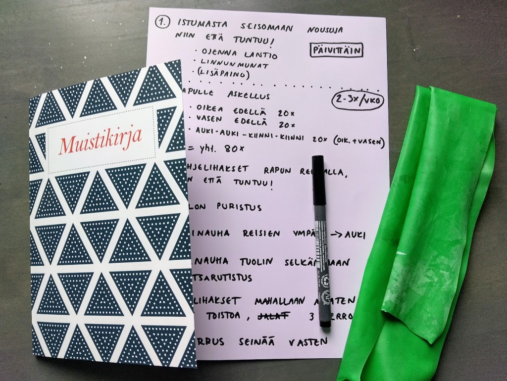 Ihana Rauna Tasapainoklinikalta kävi luonani ja laati tehokkaan jumppaohjelman. Samalla hän kehotti vaihtamaan olohuoneen pehmeän maton käytännöllisemmäksi. En haluaisi, mutta tiedän kyllä kodin olevan vaarallinen paikka. Uusi matto on harkinnassa… Samoin steppilauta, jumppakuminauha (edellinen oli ehtinyt haurastua ja risahti poikki, kun kokeilin) sekä käsipainot.